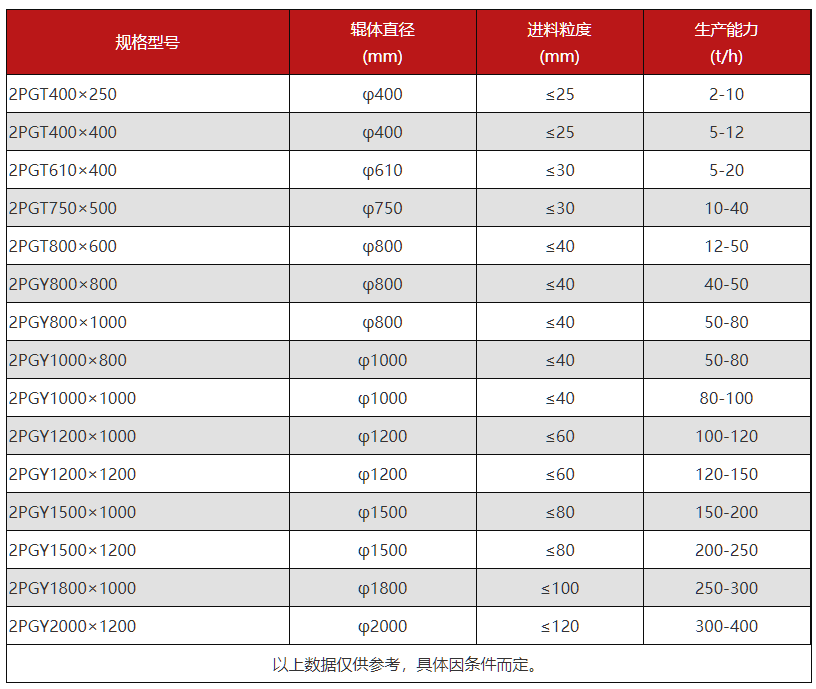 2PGT800×600 輥體直徑:800mm,輥面寬度:600mm,進料粒度:≤40mm,生產能力:12-50t/h,電機功率:2x22kw